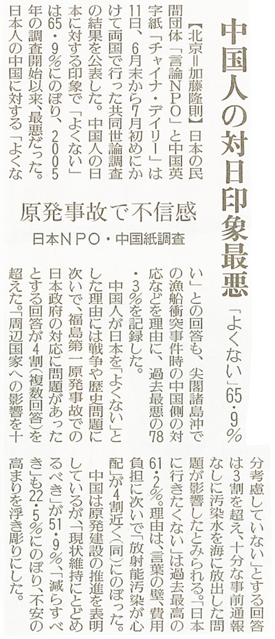 「<世論調査>日中ともに好感度が低下、尖閣諸島問題や福島原発事故が影響」
