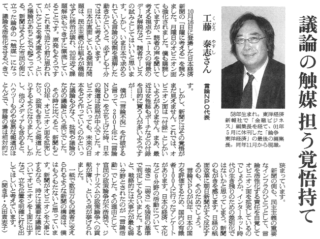 10月16日に登場した日本経済新聞の「日曜に考える」を読みました。月曜日のオピニオン面も強化されました。僕も購読していますが、読者の声を聞いて考える視点やニュースの背景のデータ解説など、読者サービスの試みとしてはいいと思います。しかし、いま日本で求められている言論の役割を理解した動きかというと、必ずしも十分ではないと考えています。