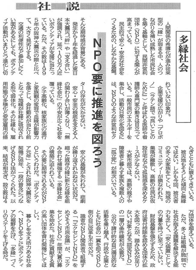 人間社会の希薄化が進み従来型の「縁」が弱まる中、人のつながりを補い成熟した市民社会を築く基軸として、民間非営利団体(NPO)に対する関心が高まっている。