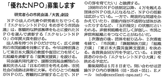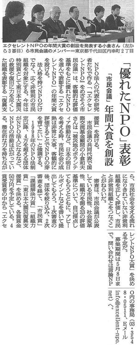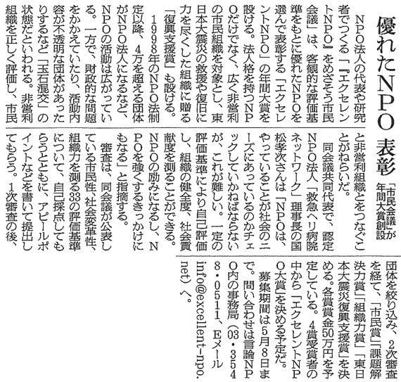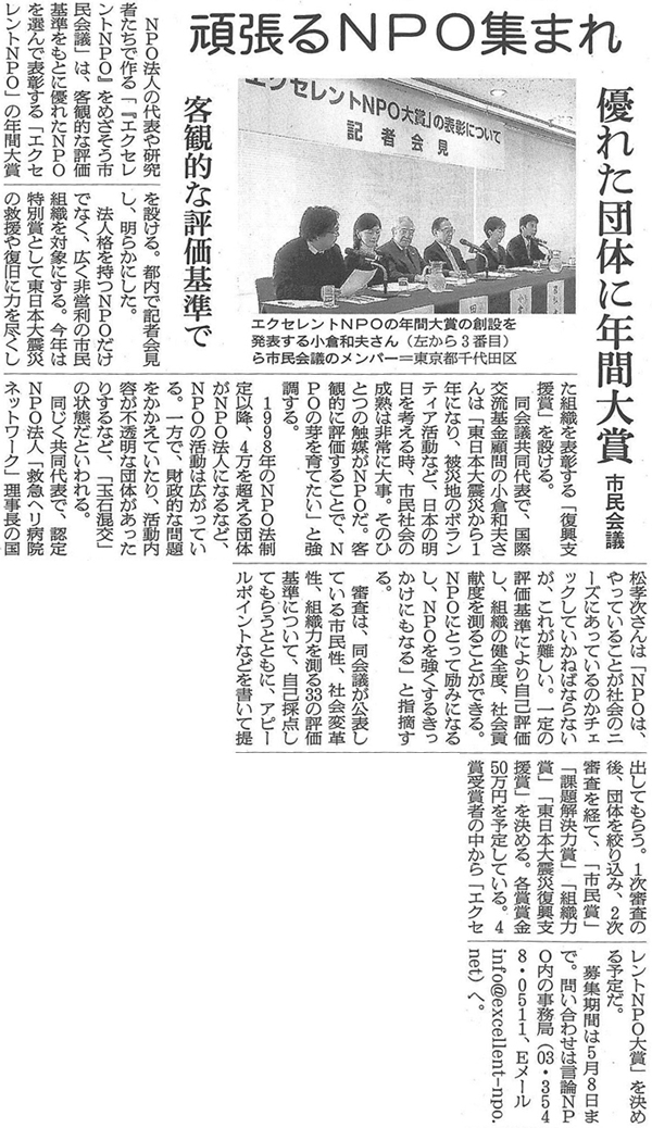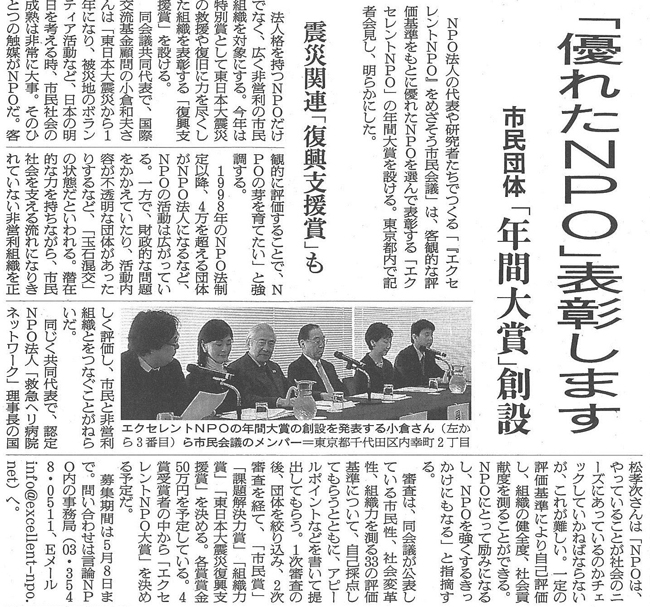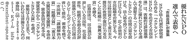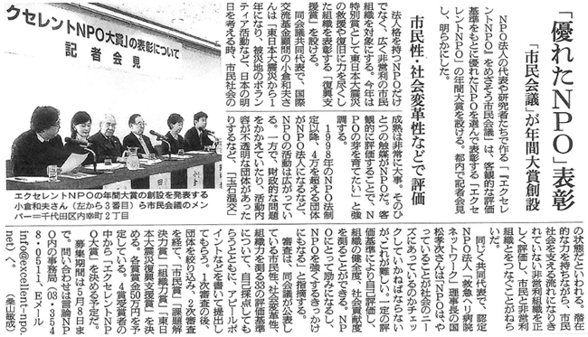 NPO法人の代表や研究者たちで作る「『エクセレントNPO』をめざそう市民会議」は、客観的な評価基準をもとに優れたNPOを選んで表彰する「エクセレントNPO」の年間大賞を設ける。都内で記者会見し、明らかにした。