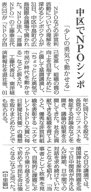 NPOなどの非営利活動についての理解を深めるシンポジウムが31日、中区中島町の広島国際会議場で開かれた。NPO法人「言論NPO」の工藤泰志代表(53)が「NPOが自己変革し、組織の室の向上を目指すために」と題して基調講演し、「ちょっとした勇気で市民が時代を動かせる」などと訴えた。
