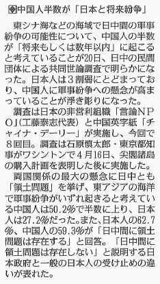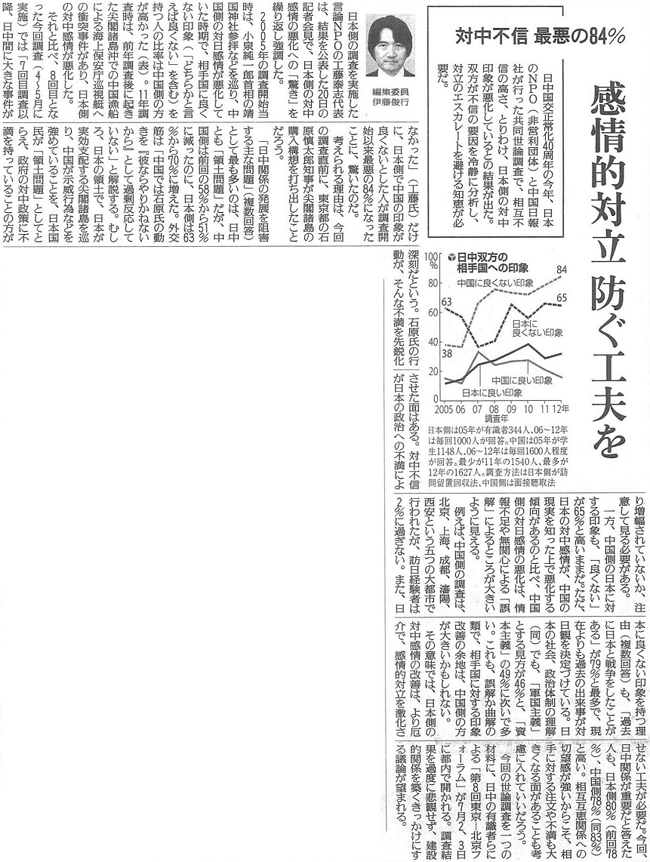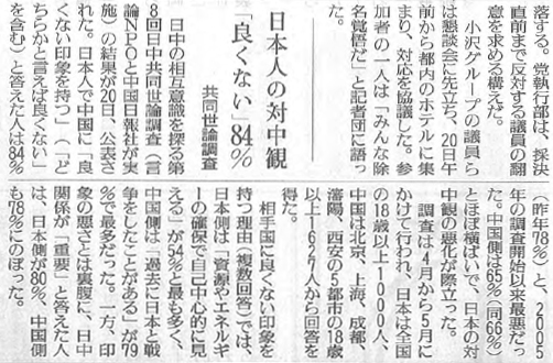 日本のNPO法人「言論NPO」と中国で英字紙を発行する中国日報社は20日、日本人の8割強が中国に良くない印象を持っているとする日中の共同世論調査の結果を発表した。調査が始まった2005年以降で最悪の状態という。