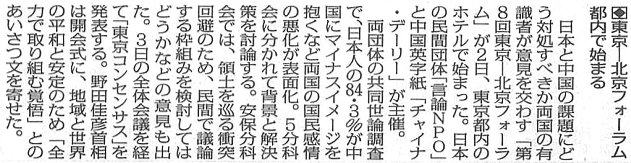 日本と中国の有識者らが政治や経済、民間交流など両国の様々な課題を議論する「東京-北京フォーラム」が2日、東京都内で始まった。3日まで開かれ、国交正常化40周年を迎える両国の新たな関係をテーマに、尖閣諸島の領有権問題などについて解決の糸口を探る。初日は800人が参加した。