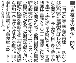 「日本の民主主義の再建―私たちは政治家に白紙委任はしない」と題した公開フォーラムが9日午後6時半から東京・赤坂の日本財団ビルで、非営利団体「言論NPO」(工藤泰志代表)の主催で開かれる。