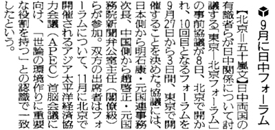 【読売新聞】【毎日新聞】9月に日中フォーラム 安保など議論 東京で開催