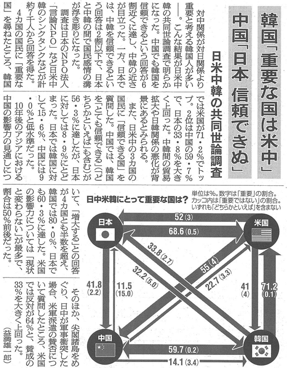 【朝日新聞】韓国『重要な国は米中』 中国『日本 信頼できぬ』 日米中韓の共同世論調査」